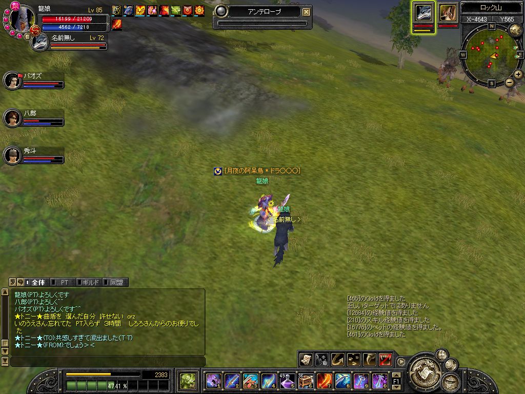 【チャットに注目。。。の図】 曲盾のみんな、がんばろう!w! ・・・狩り遅いし ・・・職戦では相手を倒せないし ・・・堅いから職戦ではスルーされる事多いし ・・・ダウン技は連携しにくいし でも でも でもね・・・ そんな曲盾が好きだ~~~~w はぁ・・・そいえば誰かが言ってたな 曲盾の人はMが多いって・・・ 一応、否定しときますw 曲盾のこのキャラに思い入れがあるだけですw ・・・多分 |