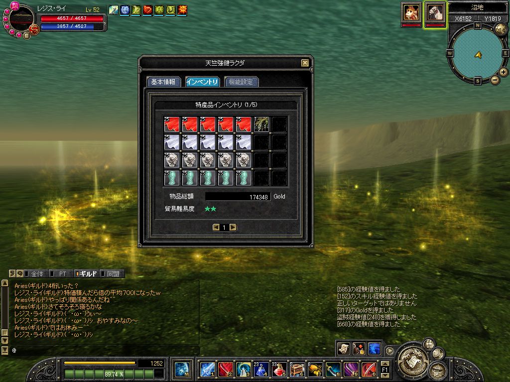 ↓荷物はこんな感じ |∀・).。oO(名前は秘密ねw) 場所は黄河なので誰もいな~いw 普通の交易品のみの場合、経験値は約300 特価品を持った状態ならなんと、700に増えたのです ( ´・ω・`)あとで調べた結果、藍氷戦士と同じくらいの経験値だったのですw |
