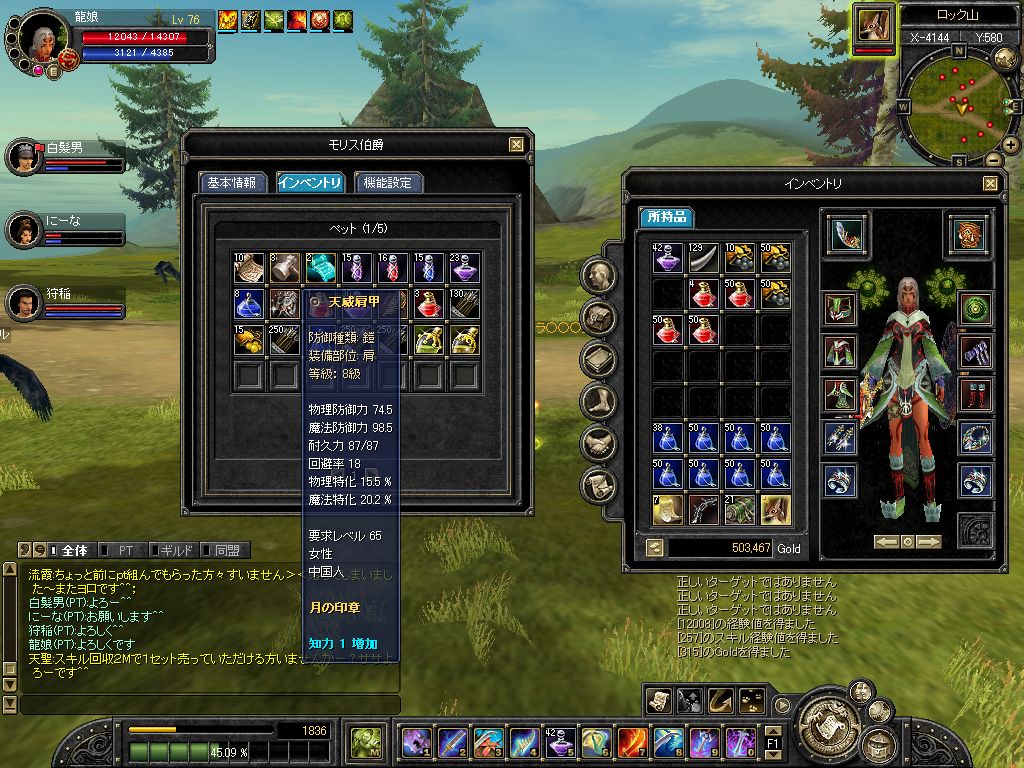 全身6級になった姿を再度お披露目 6級は全身緑っぽいんだね 緑大好き~ でも鎧は重くて走るの遅いから 次は護具になるー ●そしていつの間にか商人ランクが4にー 守ってくれたハンターの皆さんありがとー でも半分以上一人で交易しましたー (全然感謝してねー(´m`)クス) でも4だから何だって言うの… 何の得があるっていうの… 誰かお得情報教えて… |