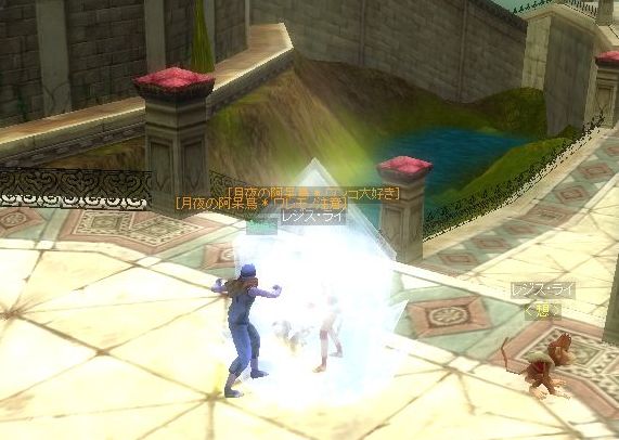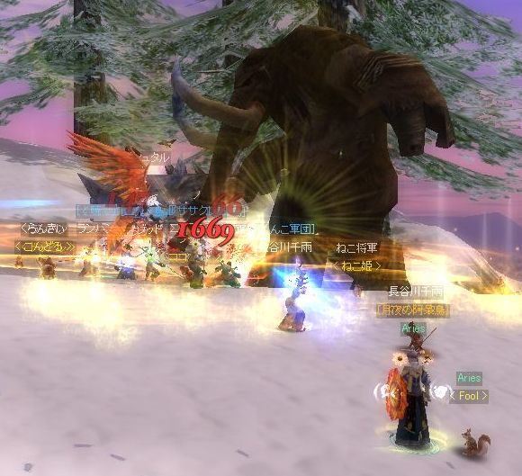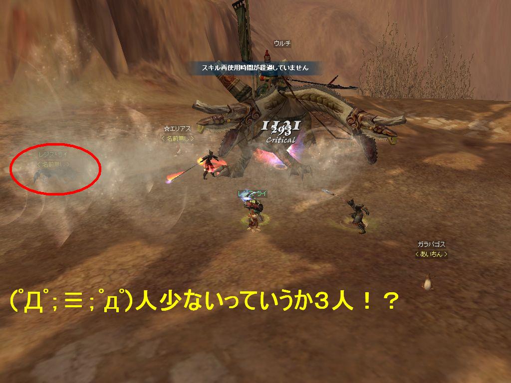 クエストの宝石集めをしていたらなんと ウルチ発見 (´・ω・`)平日の昼間ってこともあり (´;ω;`)○のところには自分の狼がウルチの臭い息に必死に耐えているところです ( ゚Д゚)y-~~ 最終的には後から来た高Lvの人に倒されちゃったんだけどねw オマケ (*´Д`)皆で浮いてますw |