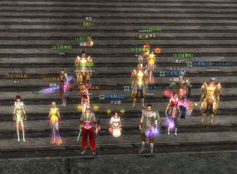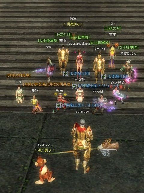 本日、新たにギルド「幻影騎士団」 が同盟に加わることになりました^^ 午後9時頃長安東門に集合 キイさん無事にIN 良かった・・・ でも華さんが^^; そしてついに記念撮影準備 suterusuさんお疲れ様^^ あ、sakuraさんの指示で並ぶ面々 人によって画面の表示が微妙に違ってくるため、なかなかうまく並べない^^; そして記念撮影 suterusuさんの顔が(TT) 今後とも皆さんよろしく^^ 楽しく盛り上げていきましょうw っていうか一匹狼と一言とかいない *このエントリは、BlogPet(ブログペット)の「つき」が書きました。 PR |
