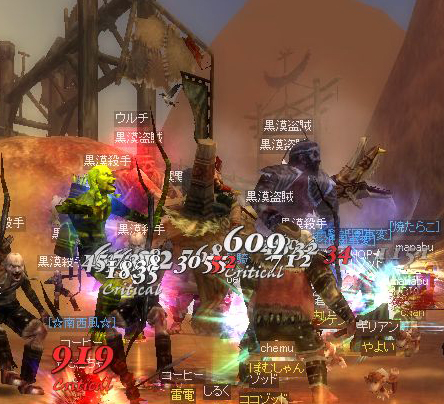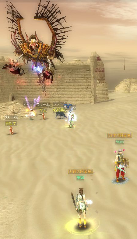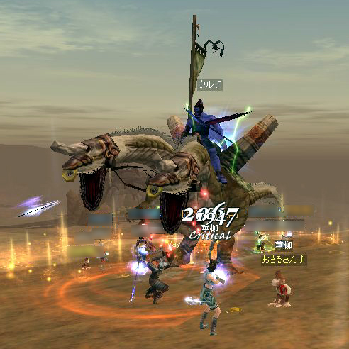 遭遇したのは、キイさんと同じくウルチ。 たいちゃんがギルチャで教えてくれたので狩場から急行したら、まだ序盤戦のようで、人は5人くらいしかいなくてウルチのHPも80%程度しか減っていない。 とりあえず周囲で死んだ人がいたら蘇生しつつ、弓をガンガン撃ってみました。 それにしても、取り巻きがあんなに何度も沸くとは想像してなかったのでびっくり。 1度は少なくともエリート2体とジャイアント1体に囲まれ、赤POT連打も空しく死亡(>_<) でも、クエストでもらった60%復活があったので、それを使って戦線復帰。 その後は死ぬこともなく、無事戦闘を終えたのでしたp(^-^)q 私はほとんど取り巻き主体に殴ってて、ウルチ本体を殴ったのは取り巻きがいない間だけだったんだけど、それでもウルチが倒されたときには経験値は20万くらい来ましたよ。 それにしても、なんかすごい楽しかった♪ これをギルドのみんなで行けたらすごく楽しそうだなぁ・・・ |