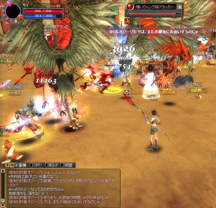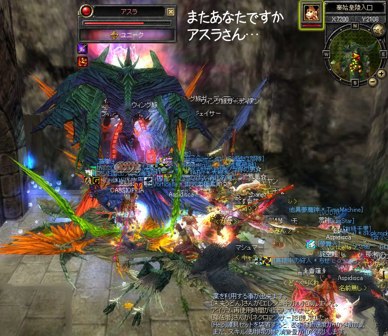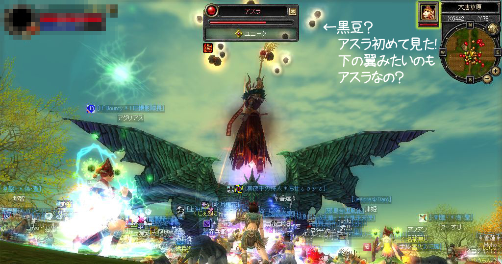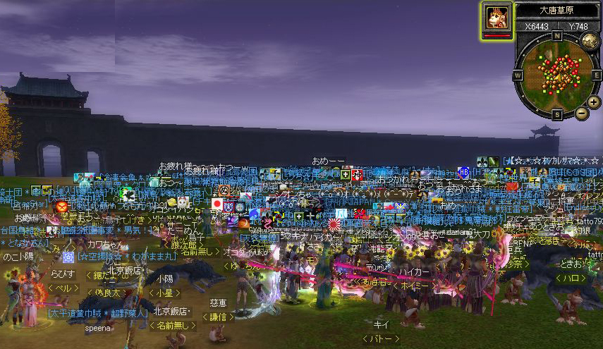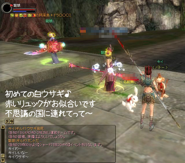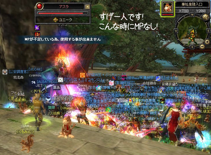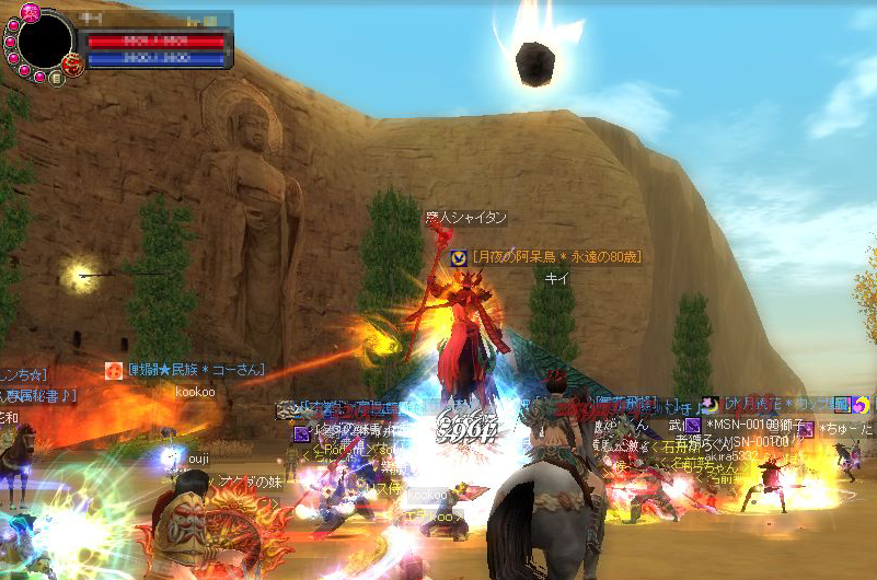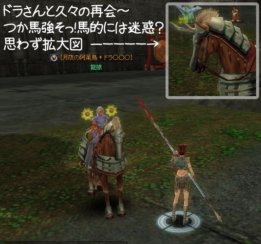 「いま石窟の前にともだちがいるぞ」 みたいなのが出たので、とりあえず石窟へGO! ◆なんかすげーのいます。空に爆発物っぽいのが浮いてますけど… とりあえず馬に乗って傍観 ◆告知でお昼寝するから帰るとかオジージが言うので 焦って馬から降りてしまう ◆すげーカッコイイと見とれているようにみえますが この後果敢にアターック!どすこ~い!!θ~∇~)=θ☆スパパーン ◆もちろん返り討ちっス… たしか6回くらい死んだかしら(`∇´ )ほほほ オジージにもグラチルにも会えなかったけど 何人か蘇生できて楽しかったよ 蘇生大好き♪⊂((〃 ̄ー ̄〃))⊃ ふふふ~ |